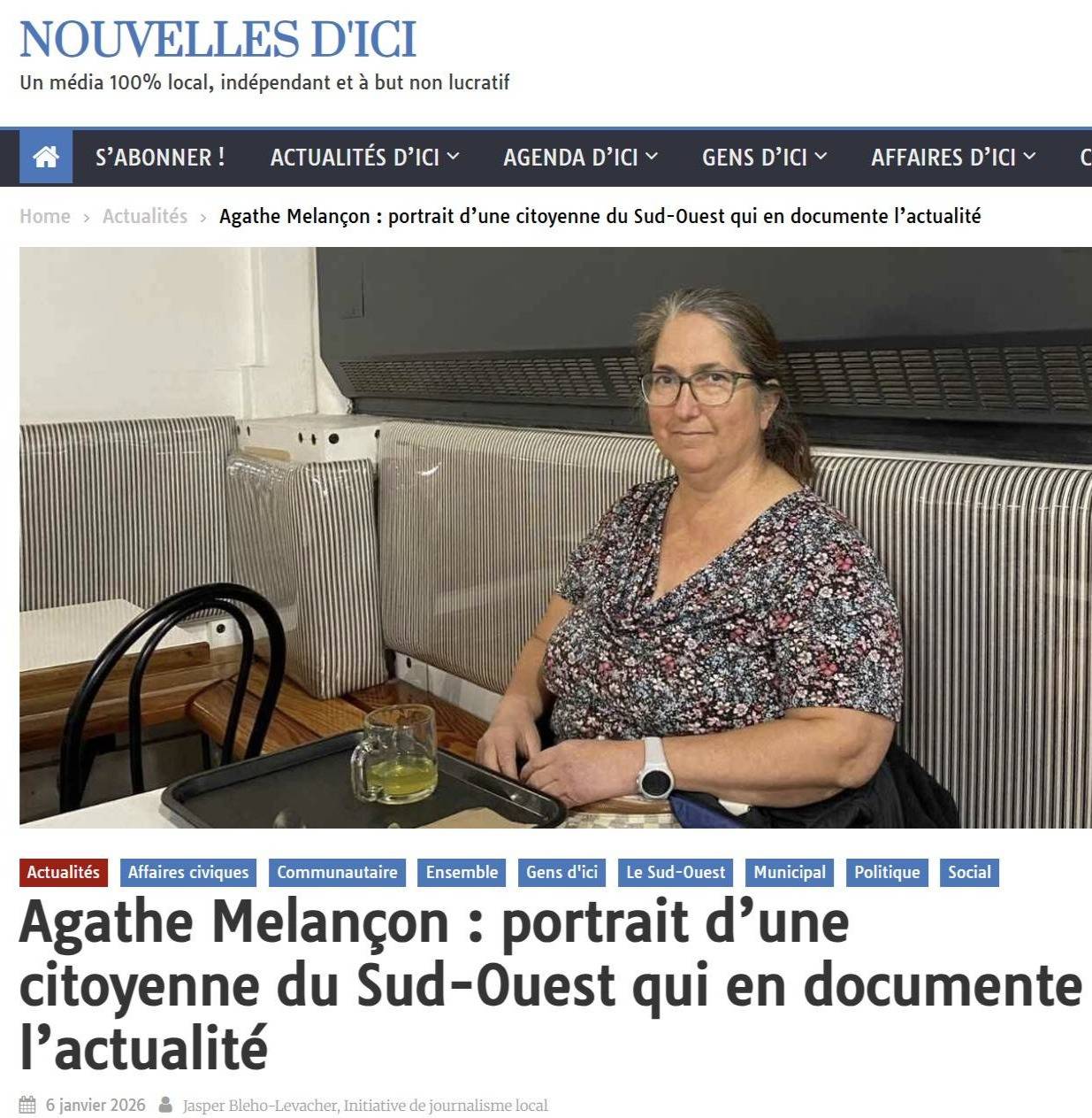 La documentaliste Agathe Melançon a été mise de l’avant par le média local Nouvelles d’Ici. Depuis août 2025, Agathe a documenté six réunions publiques, notamment dans son quartier du Sud-Ouest, où elle est très impliquée. En plus d'être documentalistes, Agathe collabore avec L'Itinéraire et publie dans son magazine.