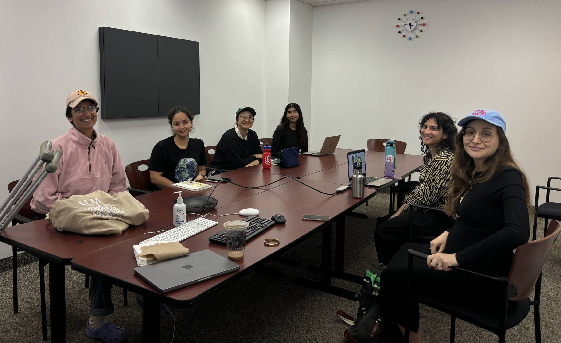 Une session de formation Documentalistes a eu lieu à l'automne dernier. De gauche à droite : les personnes en formation, Rushil Malik, Rouaida Nassif, Janice Miyagi, Aria Ipe, la directrice de la rédaction de The Green Line Yara El Murr, et l'ancienne responsable de l'engagement communautaire, Mary Newman