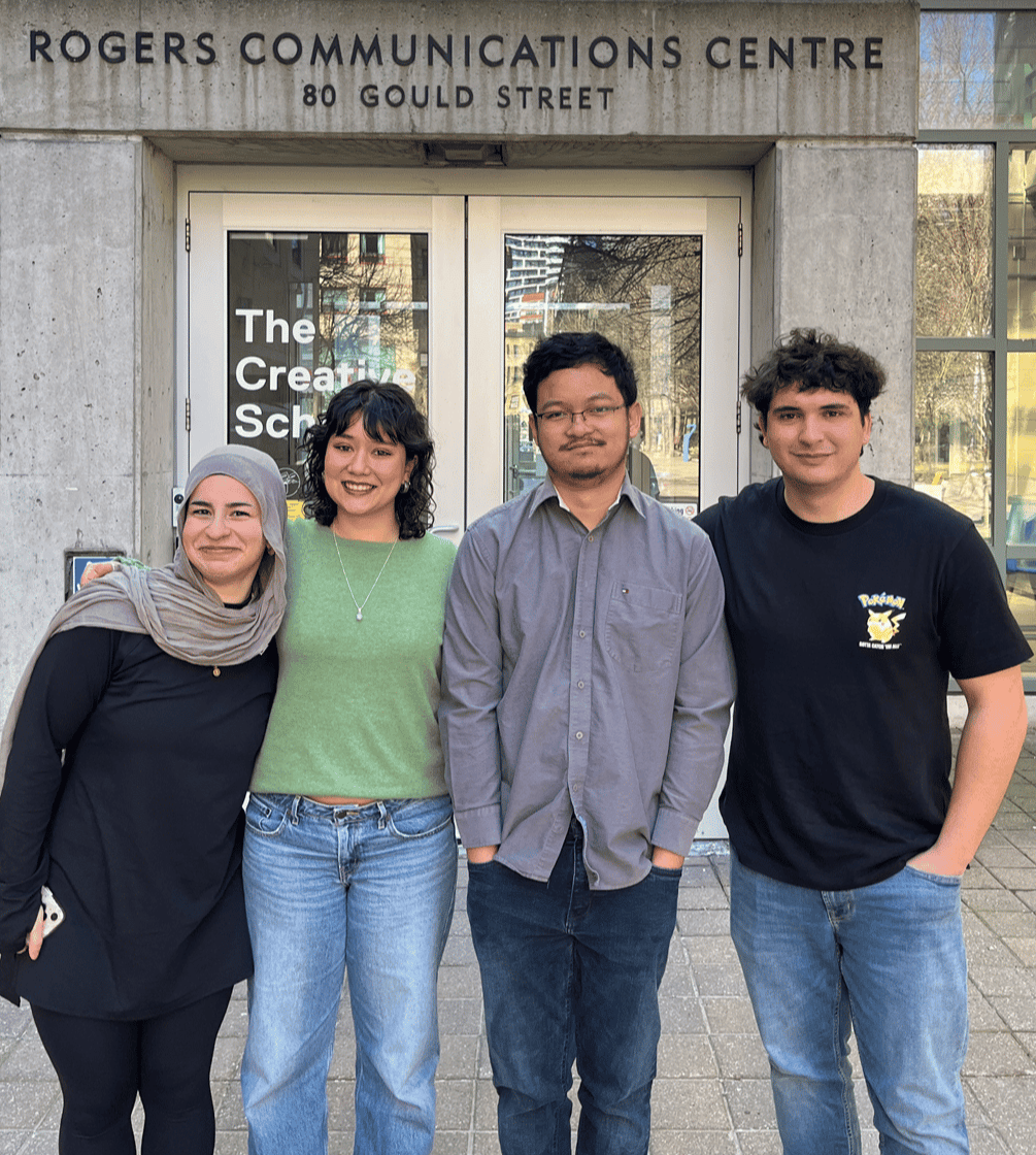 La responsable de l’engagement communautaire, Aia Jaber (gauche), et trois étudiant·e·s de TMU documentant des réunions publiques (de gauche à droite) : Emma Amodio, Christian Malong et Jack Cochrane. Photo: Addie Tiller.